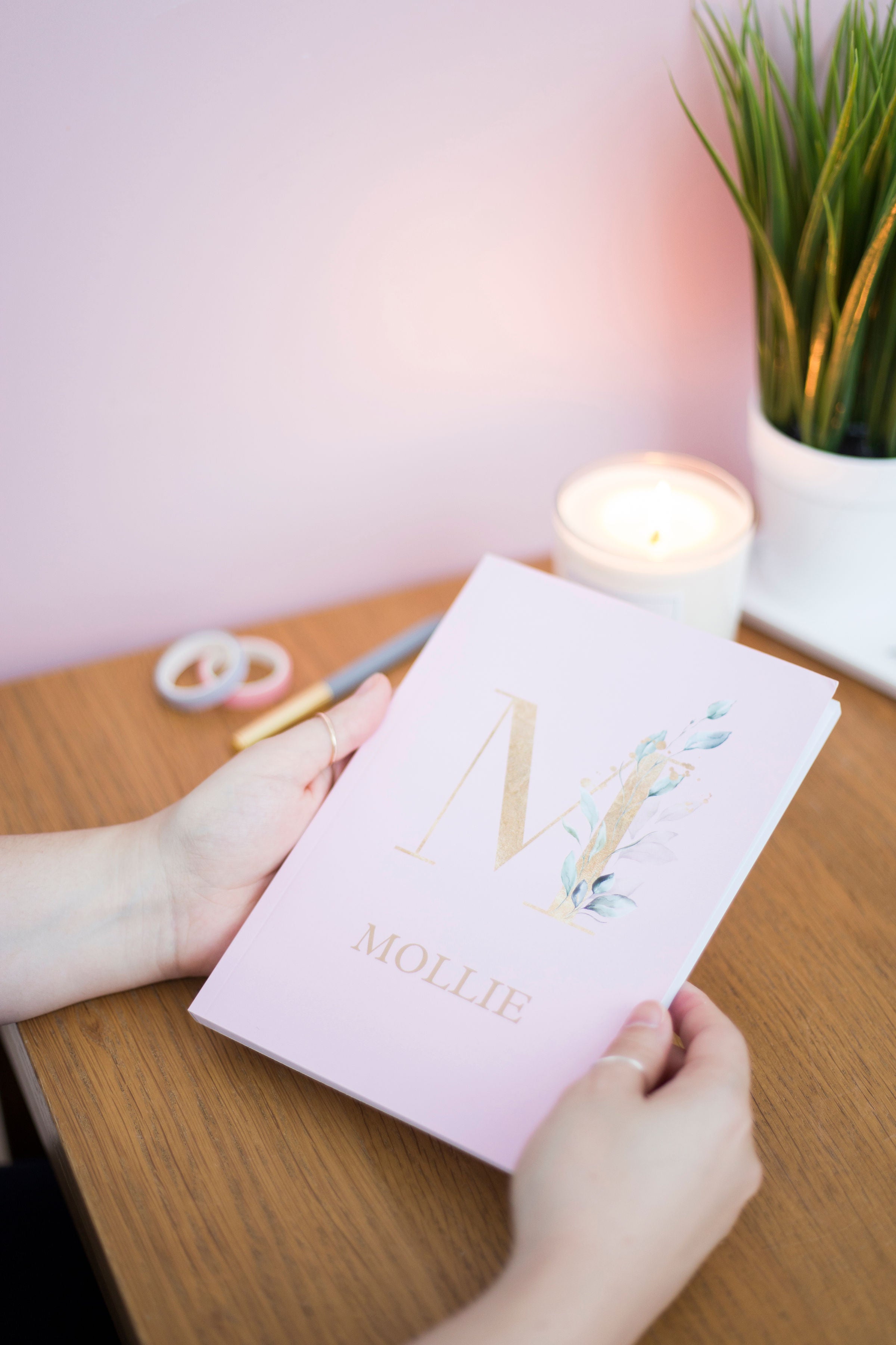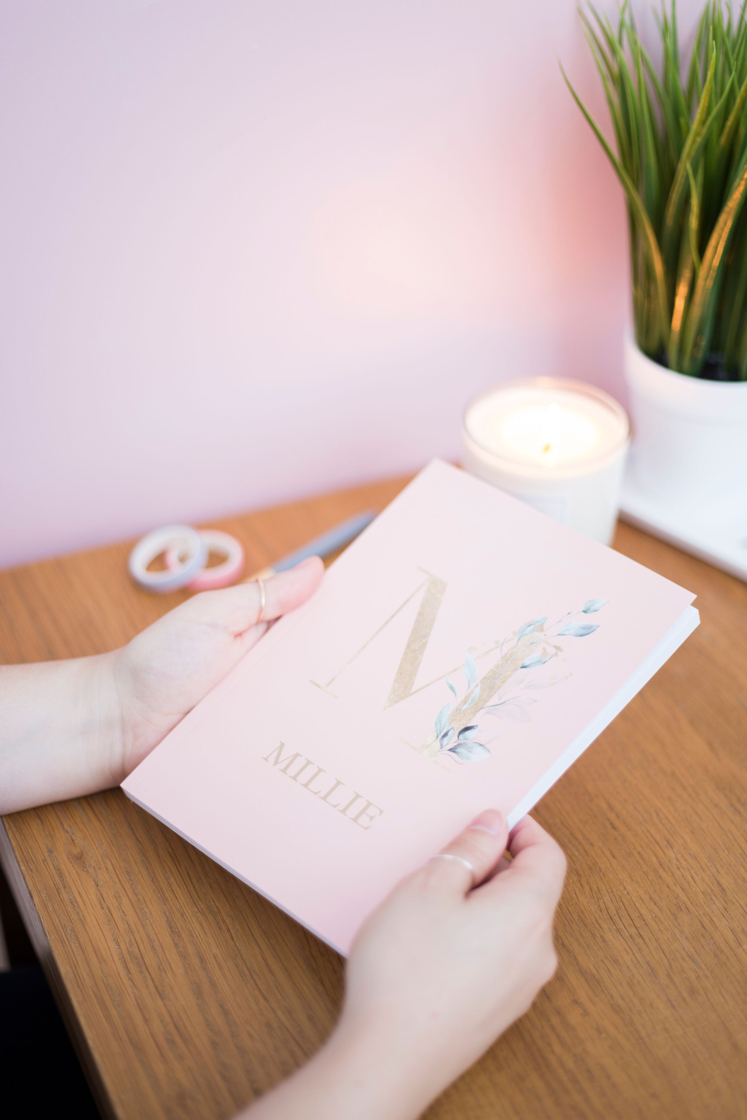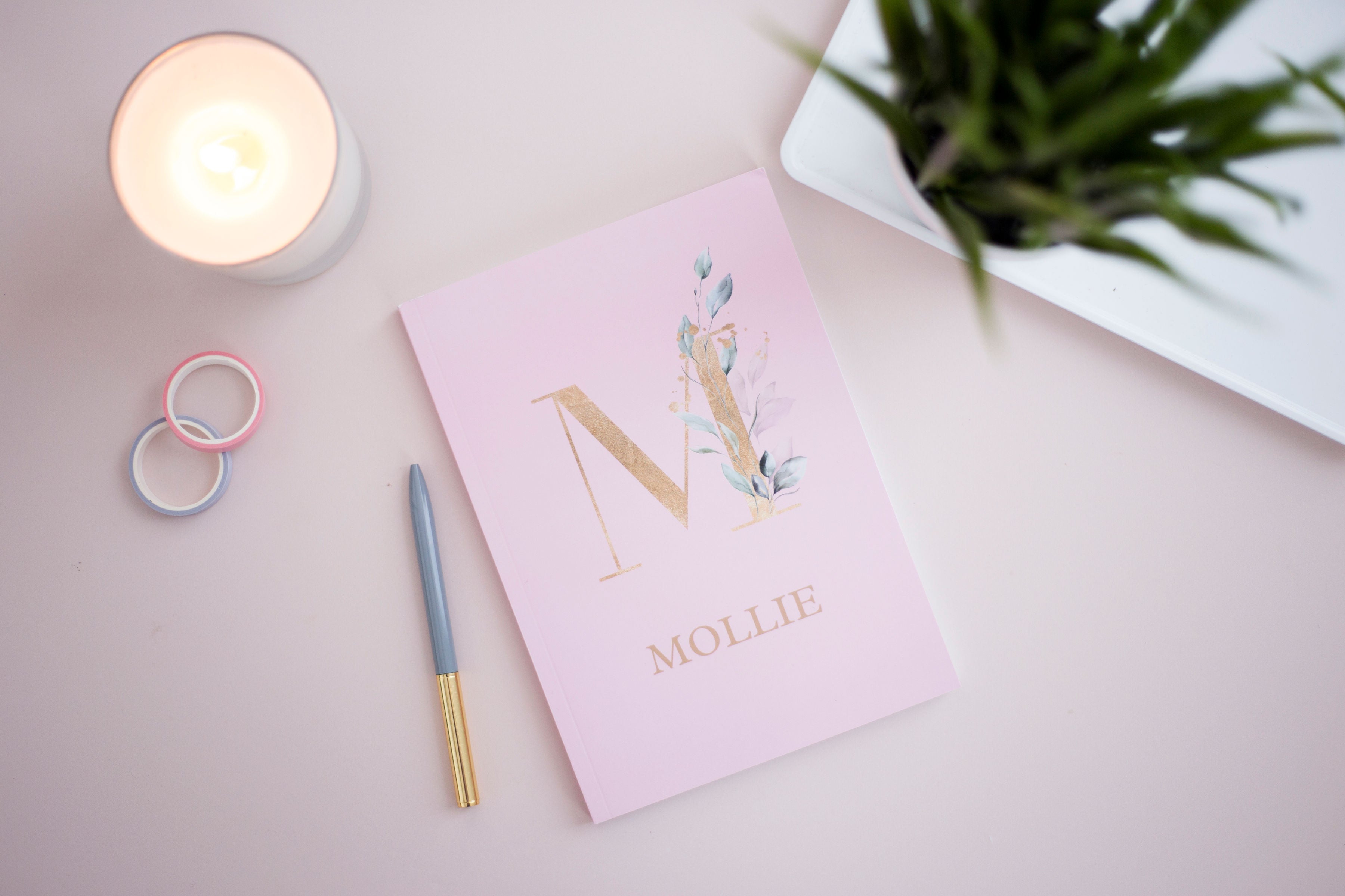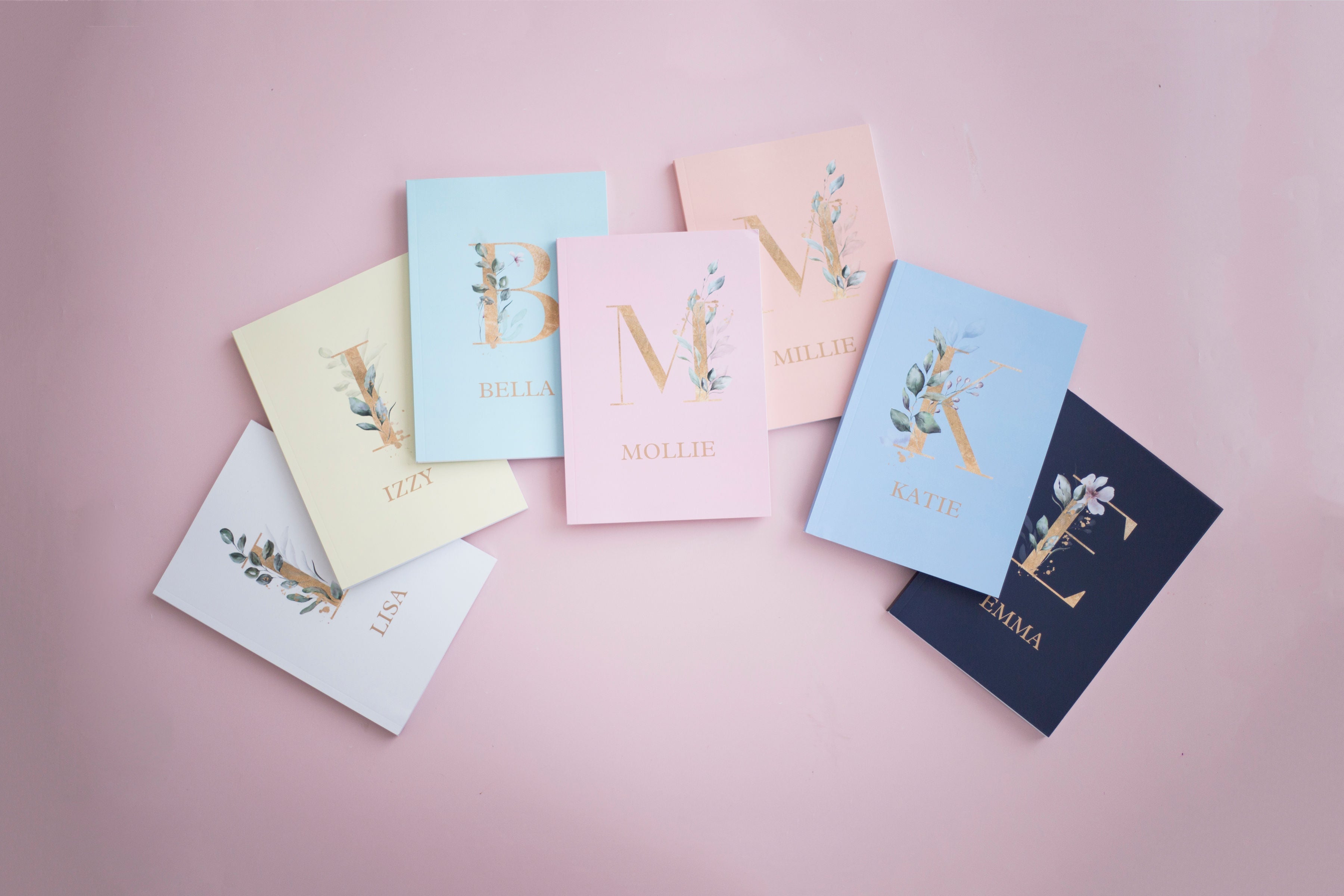 This beautiful, personalised notebook is perfect for your notes, lists and journaling, and makes a lovely gift for a friend! The pretty pastel colour options and golden and green leaf and flower design can incorporate your choice of initial letter and name. It also makes a gorgeous addition to a bridesmaid gift box.