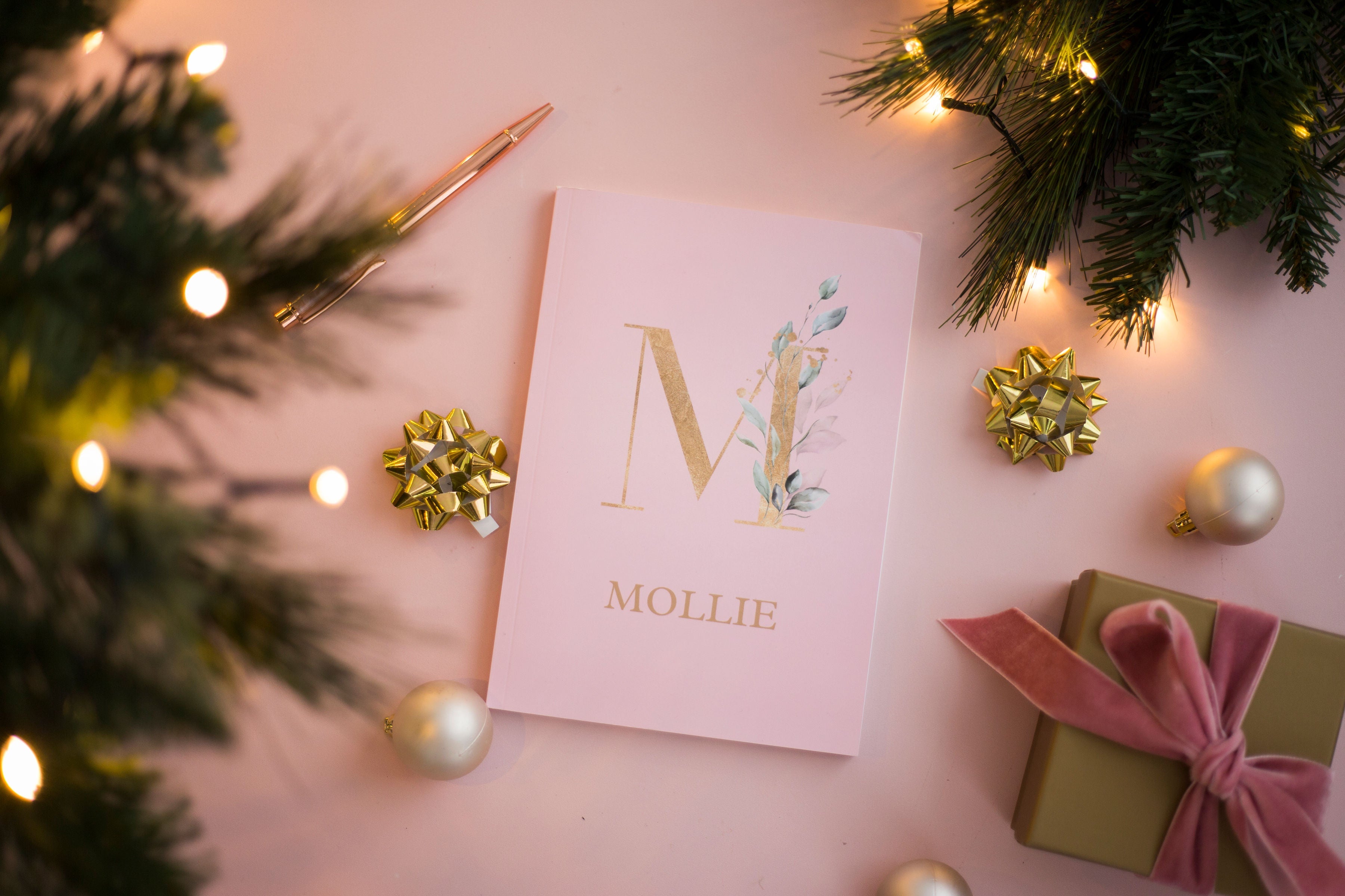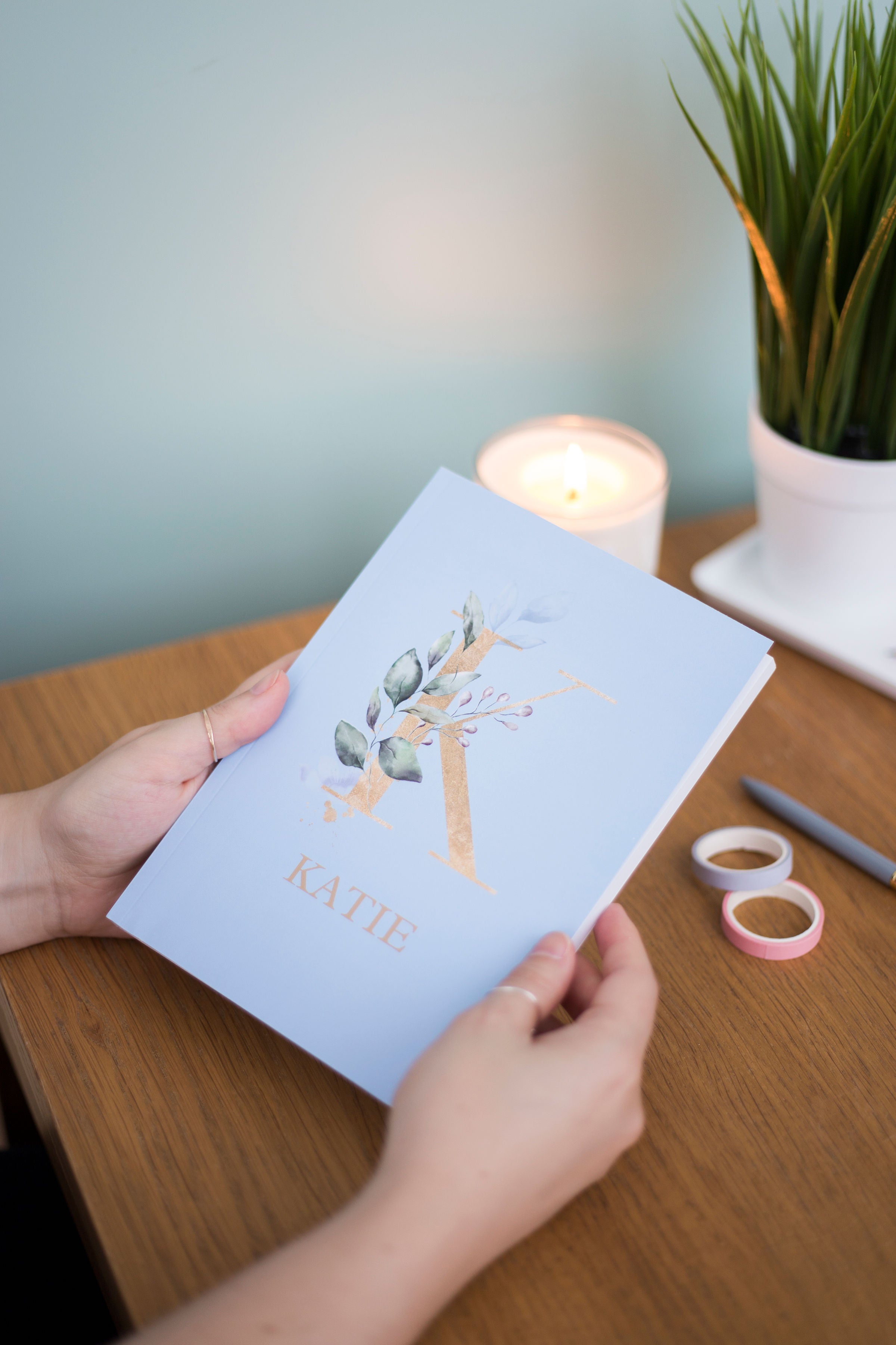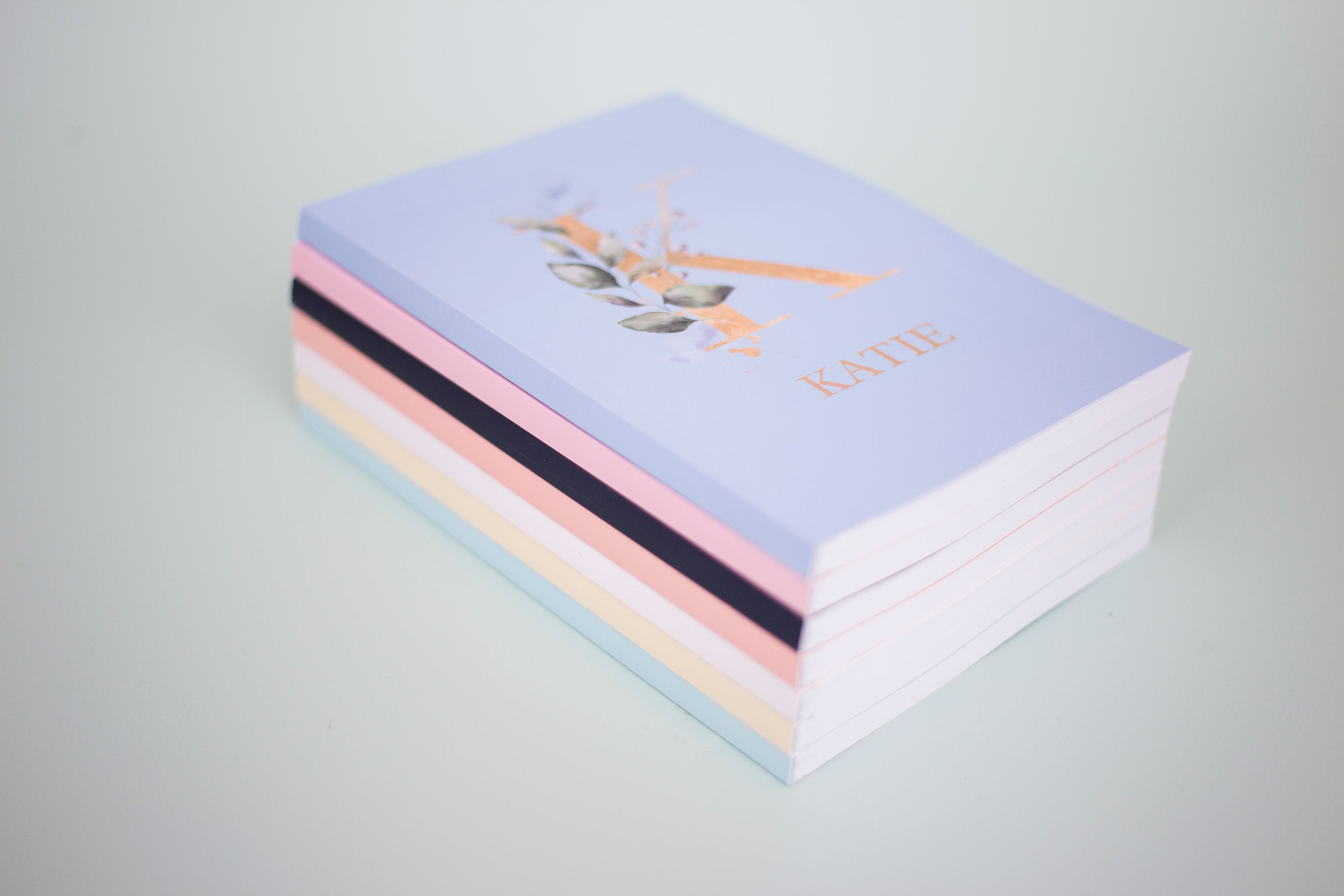 This beautiful, personalised notebook is perfect for your notes, lists and journaling, and makes a lovely gift for a friend! The pretty pastel colour options and golden and green leaf and flower design can incorporate your choice of initial letter and name. It also makes a gorgeous addition to a bridesmaid gift box.