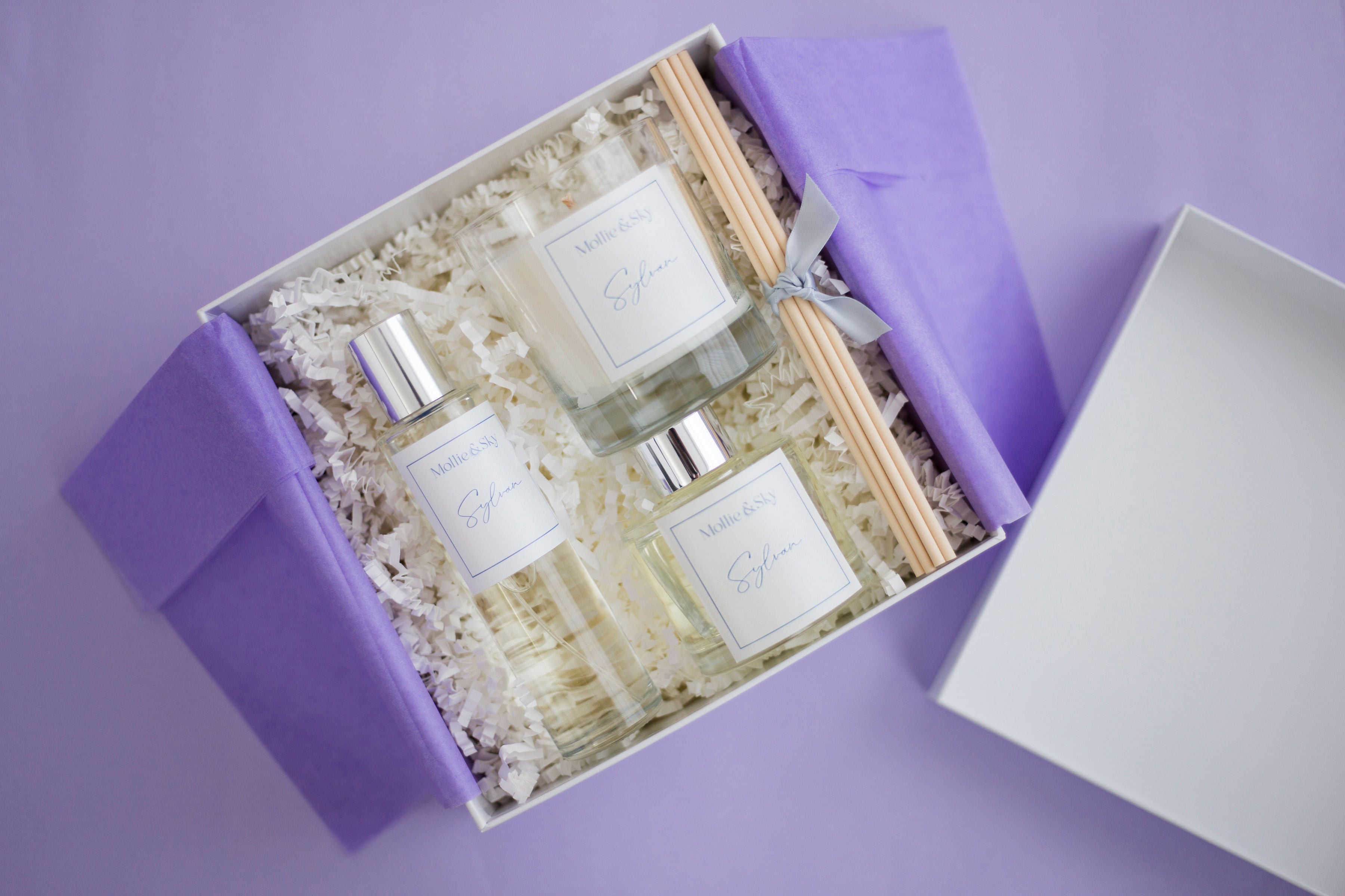 Luxury gift set, handmade with 100% natural ingredients and essential oils. The gorgeous vanilla musk and lavender scent creates a wonderfully relaxing atmosphere ready for a beautiful night's sleep.