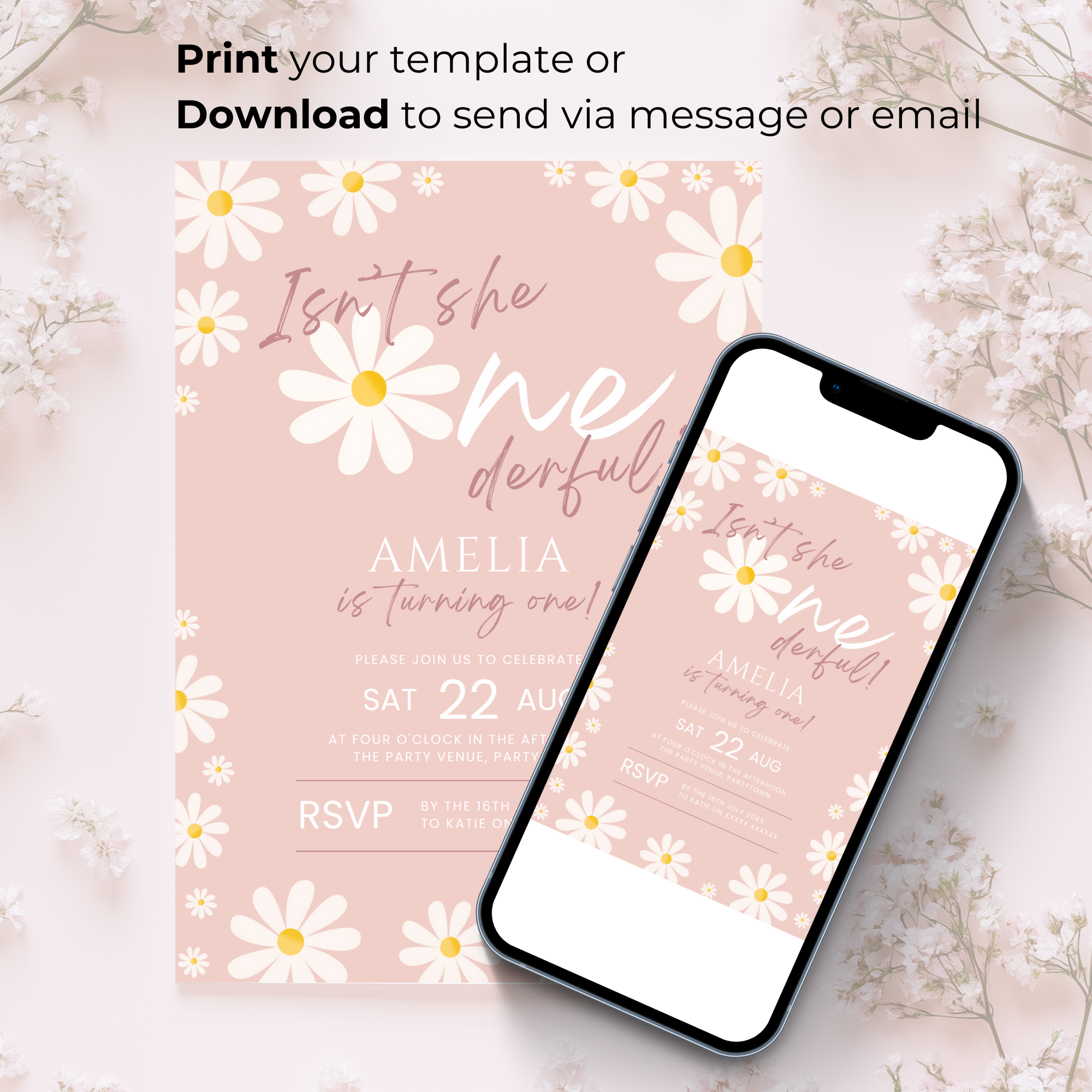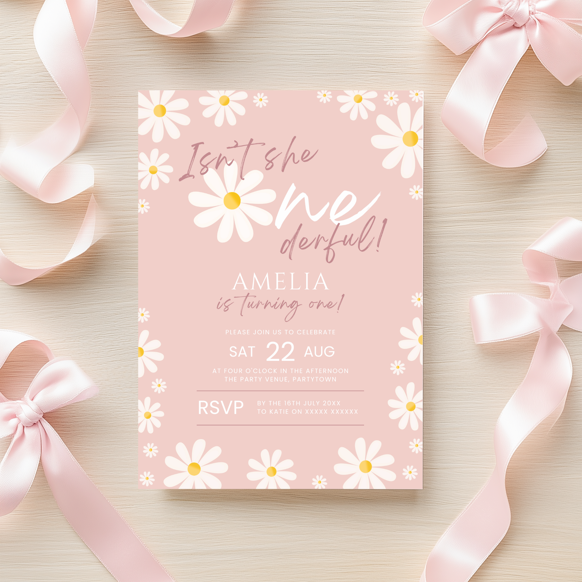 Celebrate your little one’s big milestone with this Daisy Isn't She ONEderful Birthday Invitation! Designed with sweet daisy florals and soft, pink tones, this first birthday invite is perfect for a baby girl’s "onederful" celebration. The editable template allows you to easily customize all the party details, and it’s available as a custom digital download or e-invite. Make her 1st birthday extra special with this charming and cheerful daisy-themed invitation! 🌼✨🎀