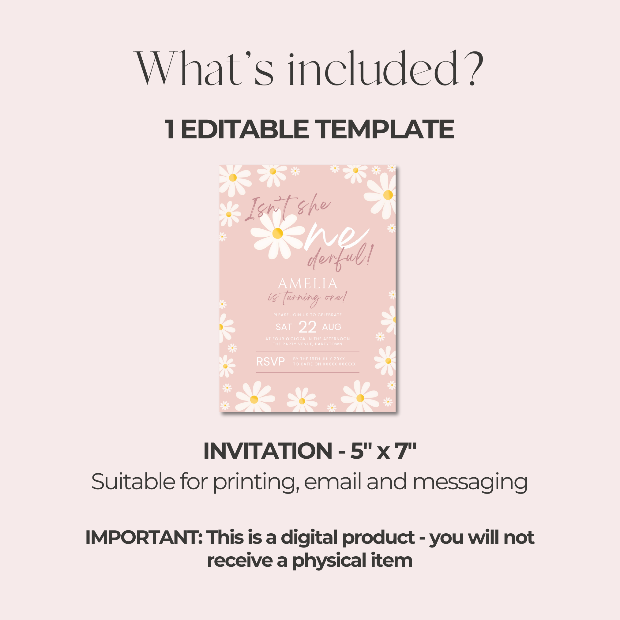 • Onederful Daisy 1st Birthday Invitation - 5x7 inch template